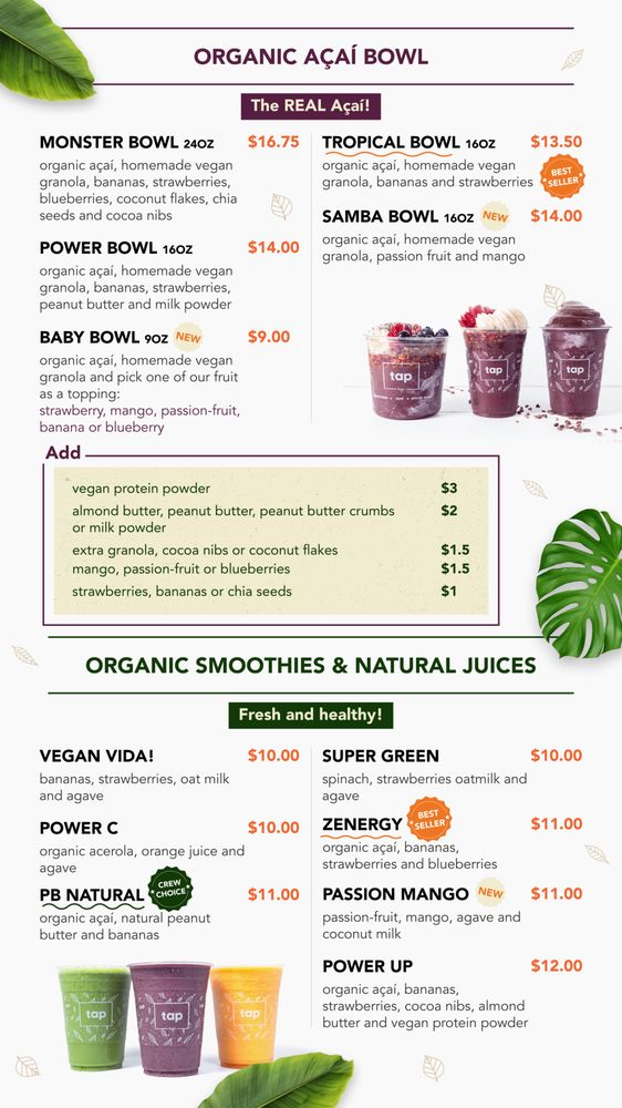Tap NYC, located at 267 Columbus Ave in New York, offers a unique dining experience with a focus on gluten-free options. Their menu features Tapioca Egg Wraps, Tapioca Sandwiches, and The REAL Açaí Bowls. Customer reviews rave about the delicious and innovative dishes, praising the gluten-free and vegan-friendly options. The cozy and trendy ambience, combined with quick and friendly service, makes Tap NYC a must-visit spot for those looking for a healthy and satisfying meal. Whether you're craving a savory sandwich or a refreshing açaí bowl, Tap NYC has something for everyone. Don't miss out on the opportunity to indulge in creative flavors and textures at this hidden gem in the bustling city. Visit Tap NYC today and experience the delicious blend of flavors that sets them apart from the rest.
